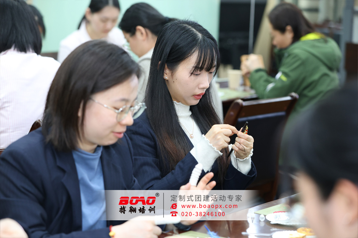 在數(shù)字金融與智能服務(wù)快速迭代的今天,銀行團(tuán)隊(duì)需要時(shí)刻保持敏銳與高效。然而,搏翱廣州拓展培訓(xùn)公司深信,持續(xù)的高效源自?xún)?nèi)心的寧?kù)o與團(tuán)隊(duì)的和諧。因此,我們選擇了“古風(fēng)首飾發(fā)簪”這一極具東方美學(xué)意蘊(yùn)與手作溫度的主題,作為此次團(tuán)建的載體。發(fā)簪,不僅是束發(fā)之器,更是貫穿中華千年文明的禮儀之物與情感信物,承載著“結(jié)發(fā)同心”的美好寓意。制作一枚發(fā)簪,從設(shè)計(jì)構(gòu)圖、選材配色,到繞線鑲嵌、組裝定型,每一步都需沉心靜氣,傾注巧思。這不僅僅是一項(xiàng)手工活動(dòng),更是一次對(duì)“慢工出細(xì)活”傳統(tǒng)匠心的深度體驗(yàn),一場(chǎng)在指尖流淌的團(tuán)隊(duì)美學(xué)共創(chuàng)。