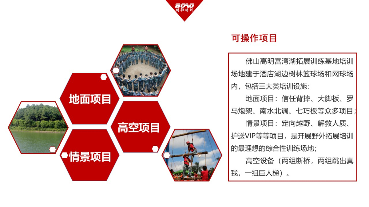 佛山高明富灣湖拓展訓(xùn)練基地培訓(xùn)場地建于酒店湖邊樹林籃球場和網(wǎng)球場內(nèi),包括三大類培訓(xùn)設(shè)施: