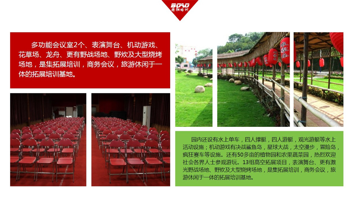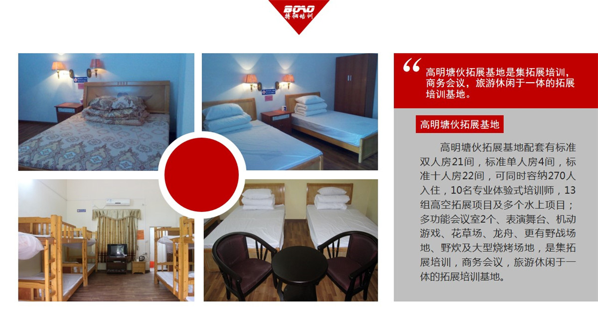 高明塘伙拓展基地配套有標(biāo)準(zhǔn)雙人房21間,標(biāo)準(zhǔn)單人房4間,標(biāo)準(zhǔn)十人房22間,可同時(shí)容納270人入住,10名專業(yè)體驗(yàn)式培訓(xùn)師,13組高空拓展項(xiàng)目及多個(gè)水上項(xiàng)目;多功能會(huì)議室2個(gè)、表演舞臺(tái)、機(jī)動(dòng)游戲、花草場(chǎng)、龍舟、更有野戰(zhàn)場(chǎng)地、野炊及大型燒烤場(chǎng)地,是集拓展培訓(xùn),商務(wù)會(huì)議,旅游休閑于一體的拓展培訓(xùn)基地。
