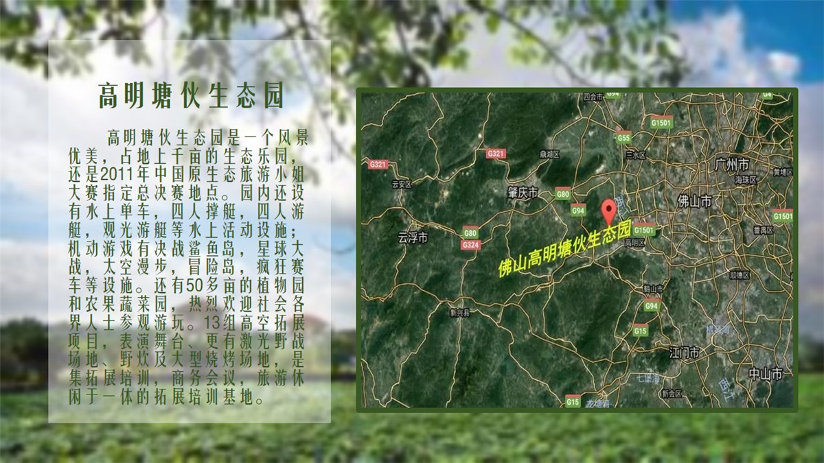 高明塘伙生態(tài)園是一個(gè)風(fēng)景優(yōu)美,占地上千畝的生態(tài)樂園,還是2011年中國(guó)原生態(tài)旅游小姐大賽指定總決賽地點(diǎn)。園內(nèi)還設(shè)有水上單車,四人撐艇,四人游艇,觀光游艇等水上活動(dòng)設(shè)施;機(jī)動(dòng)游戲有決戰(zhàn)鯊魚島,星球大戰(zhàn),太空漫步,冒險(xiǎn)島,瘋狂賽車等設(shè)施,還有50多畝的植物園和農(nóng)果蔬菜園。